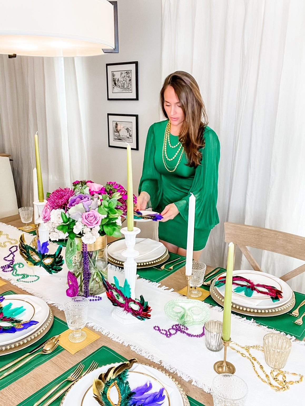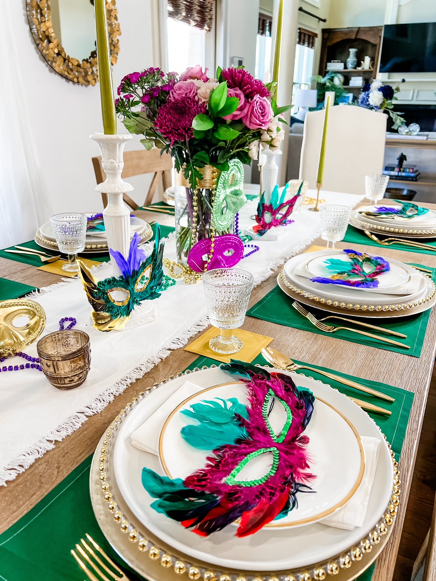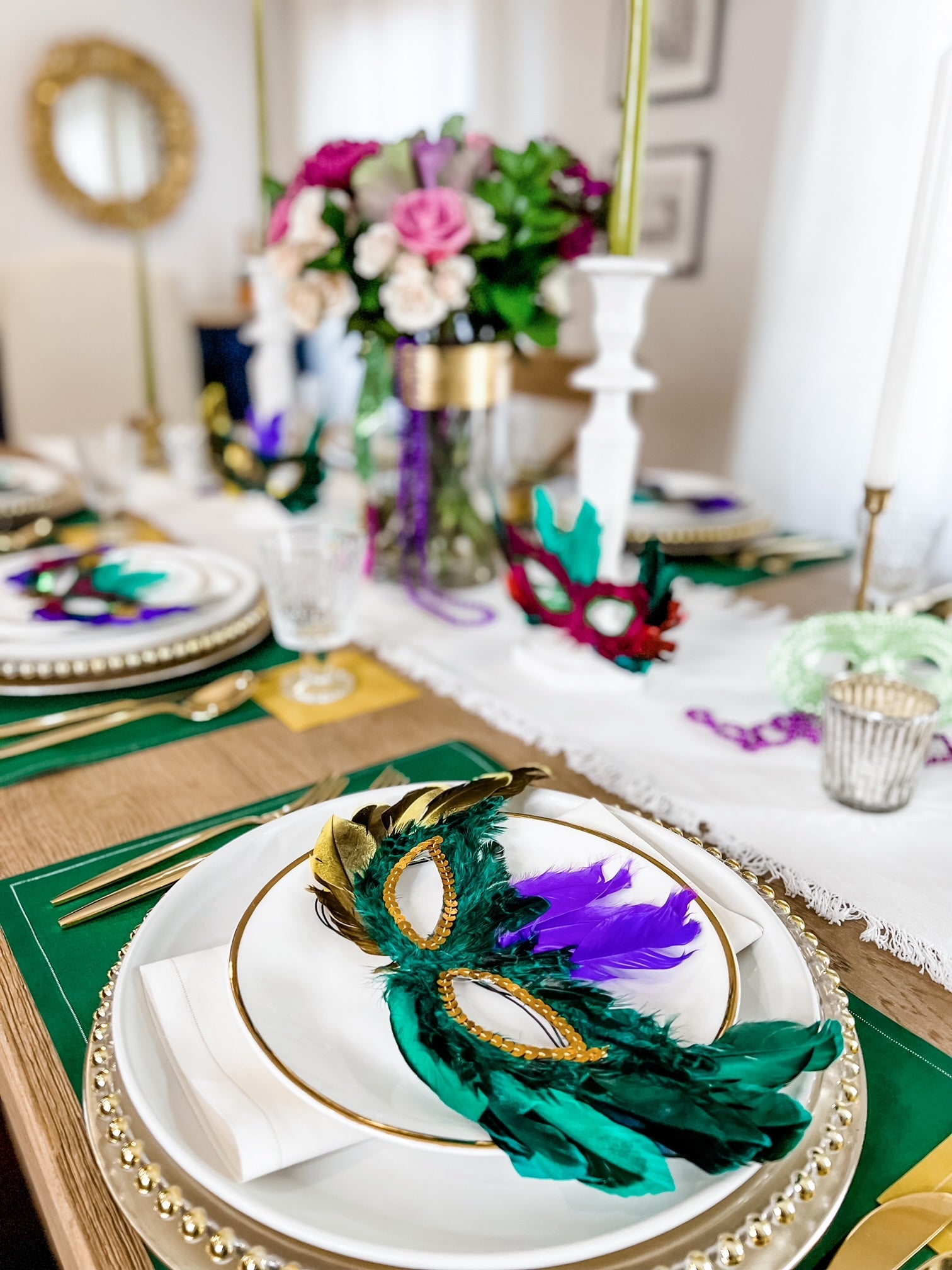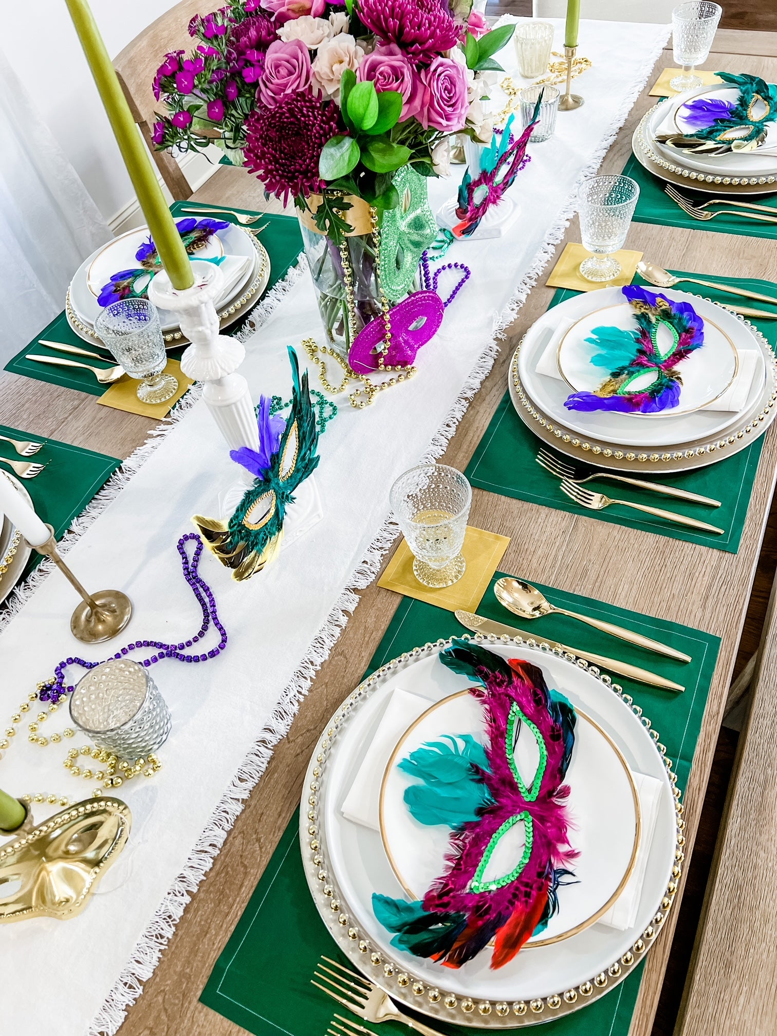 Let the good times roll with our Mask & Mingle Tablescape, a vibrant and elegant setting inspired by the spirit of Mardi Gras. Designed to capture the excitement of carnival season, this festive tablescape features Prince of Thieves (deep green) placemats as a rich, regal foundation, paired with crisp White Rabbit dinner napkins for a bright and classic contrast. Completing the look, our Golden Child (gold) cocktail napkins add a celebratory shimmer, ensuring your table is ready for a night of revelry and fun.