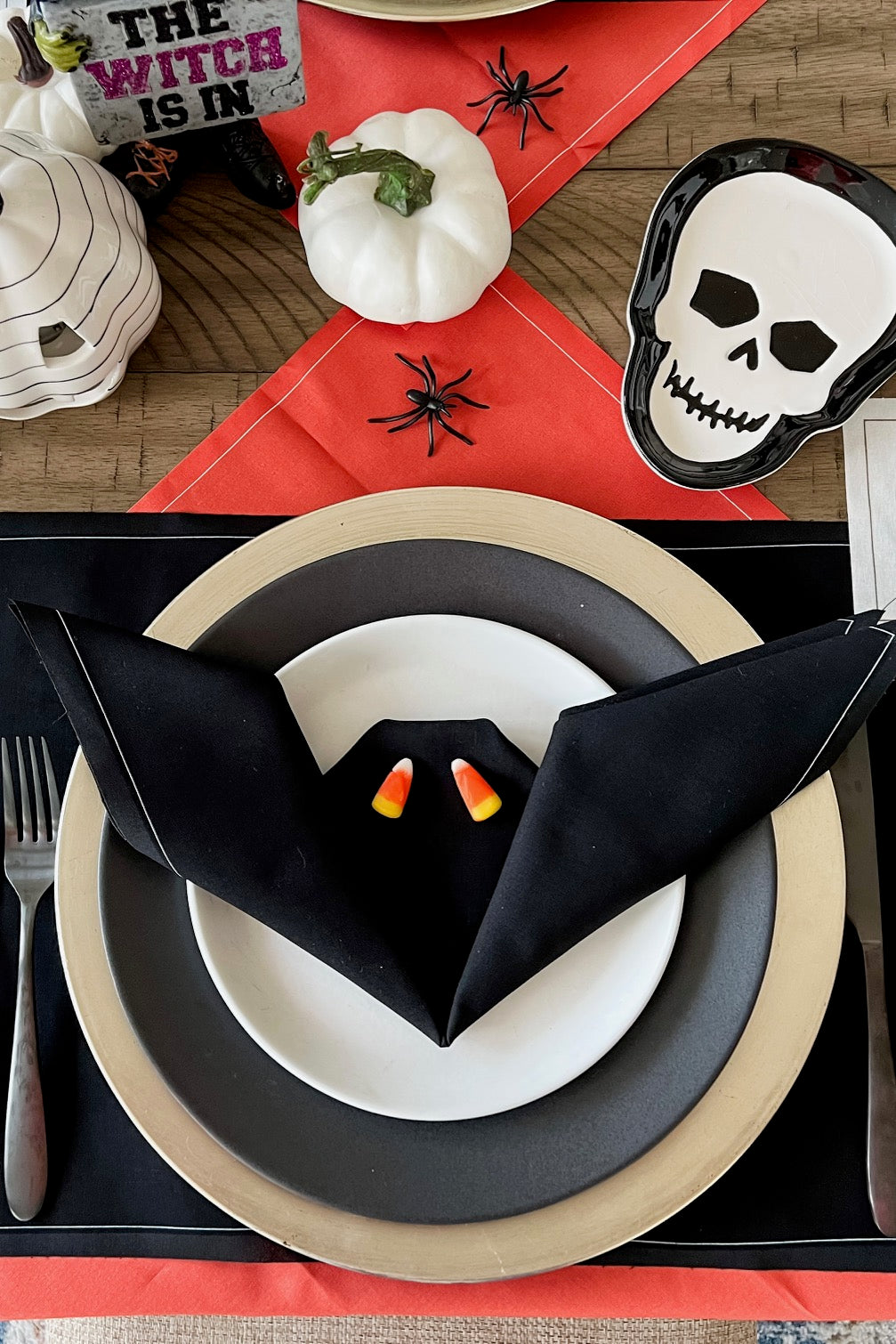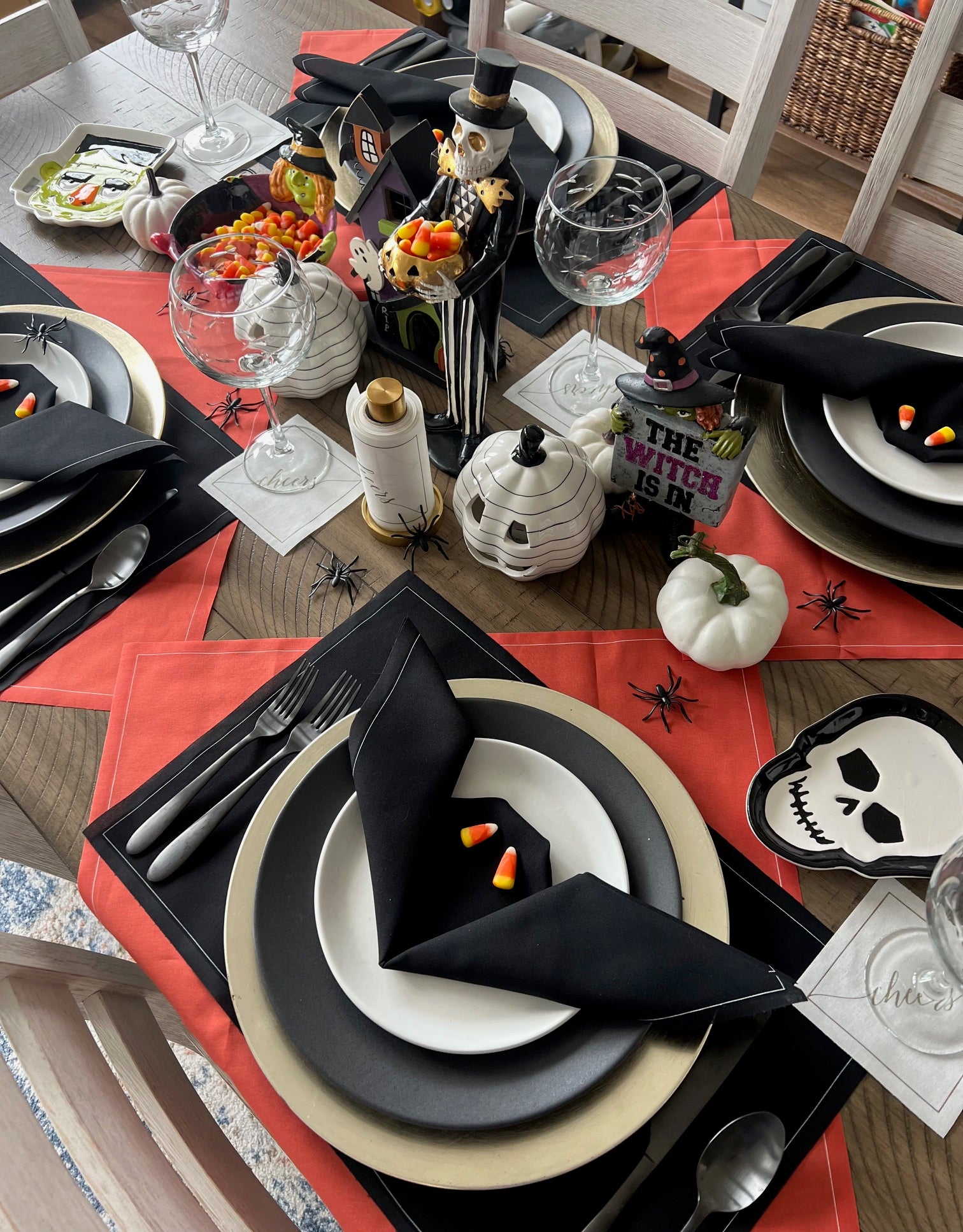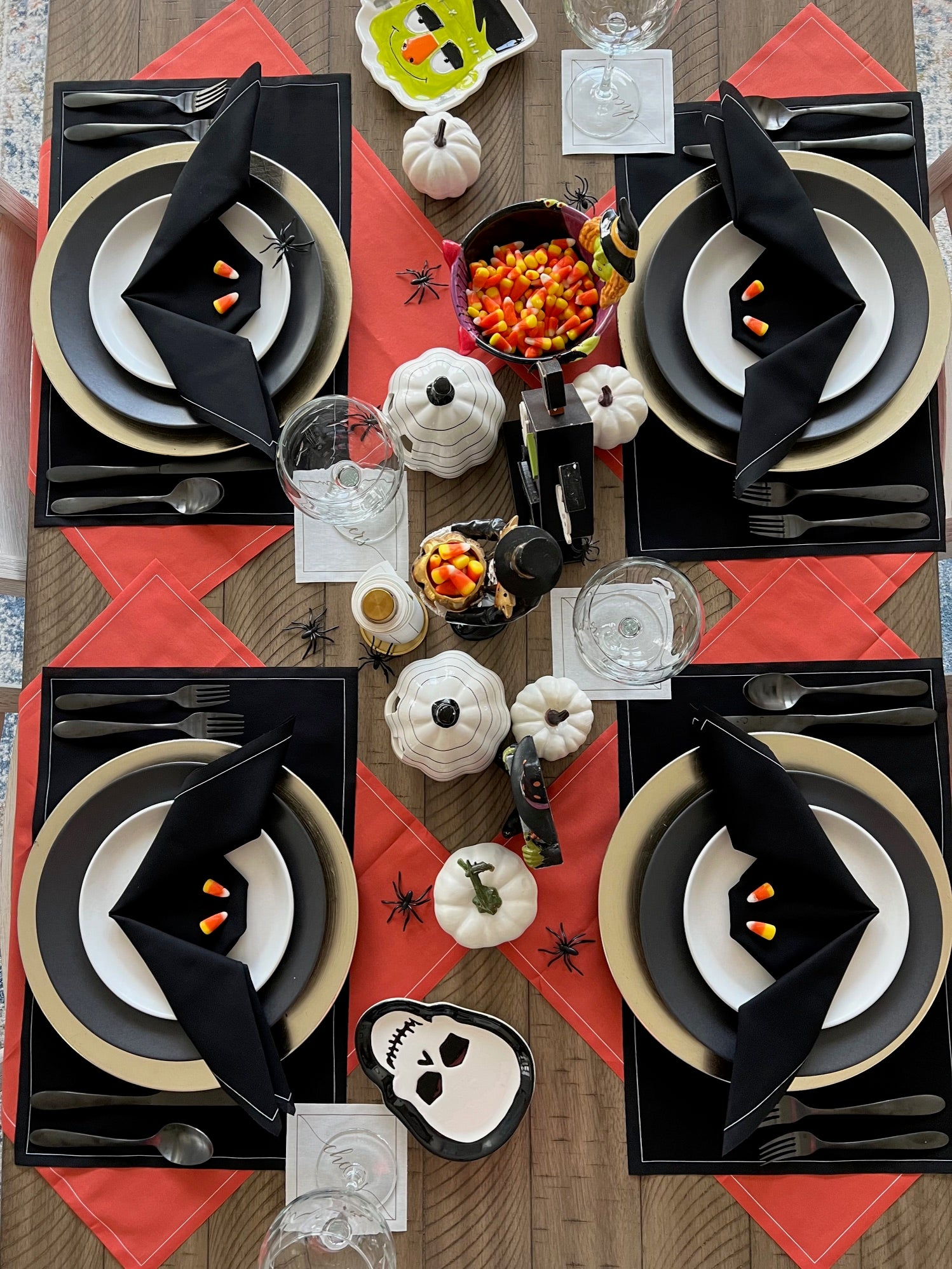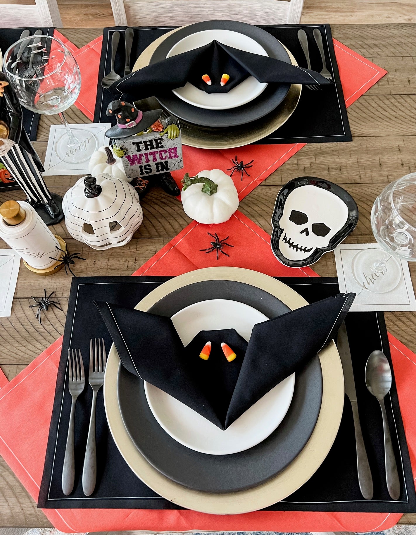 Set the scene for a fun & stylish celebration with our Going Batty Halloween Tablescape. Designed to bring playful spookiness and bold sophistication to your gathering, this look features our Queen of Spades (black) placemats as a dramatic backdrop, layered over our Late Sunset (deep orange) dinner napkins for a vibrant, festive base. Topping the setting, our Queen of Spades (black) dinner napkins are folded into whimsical bat shapes, adding a fun, eye-catching detail. Our Golden Salute (white) cocktail napkins provide a crisp contrast, completing a tablescape that is as chic as it is fun.