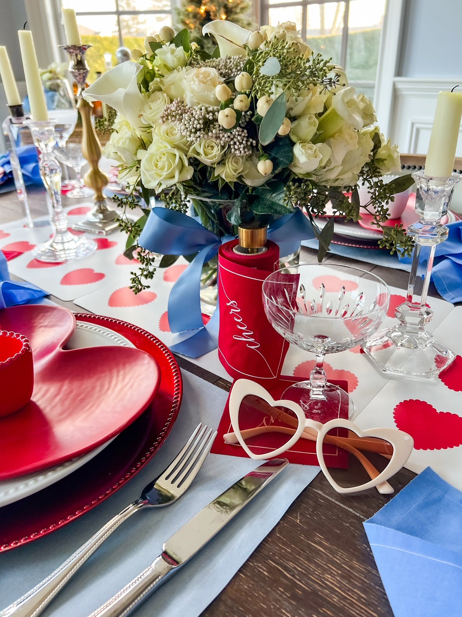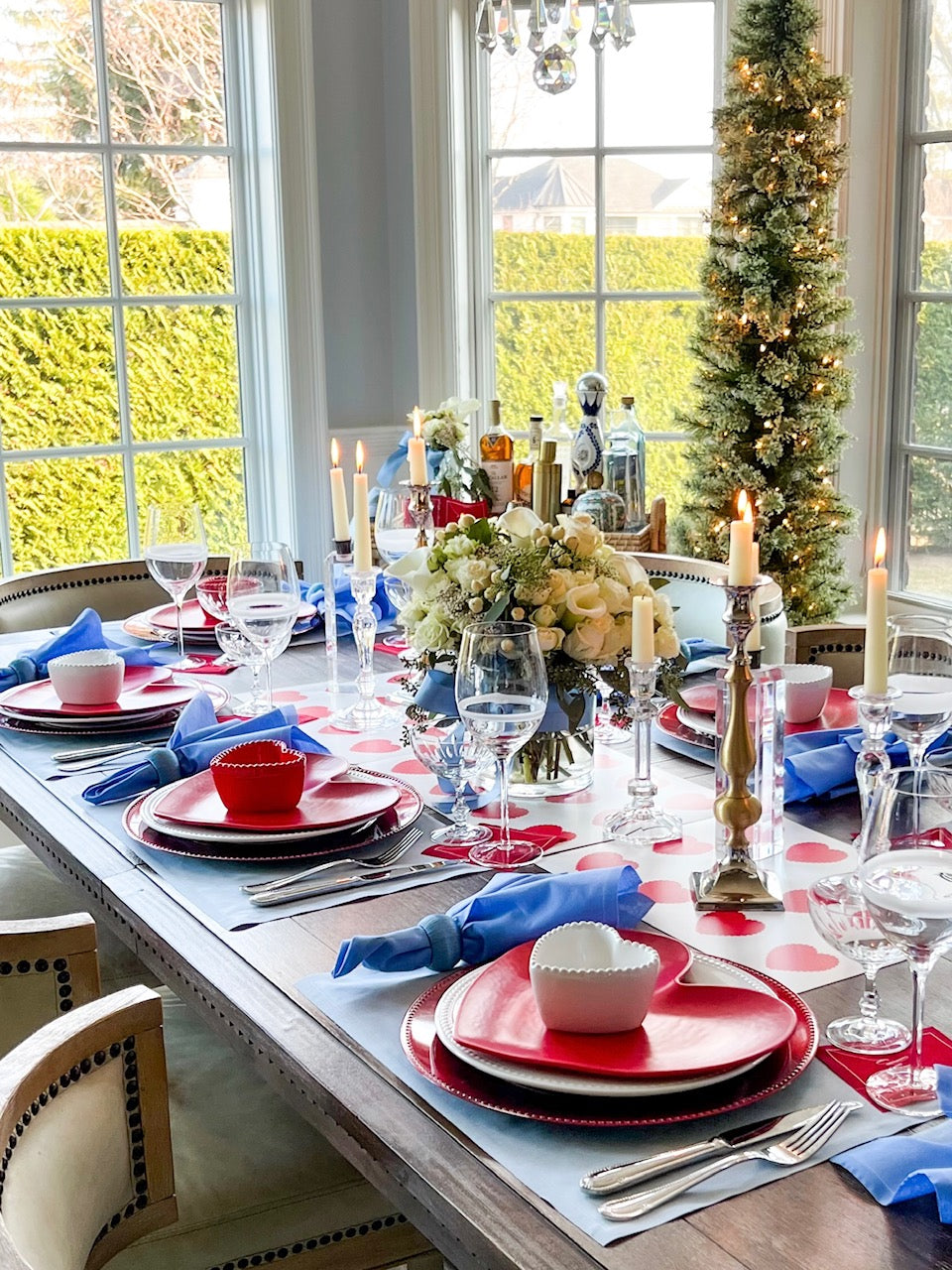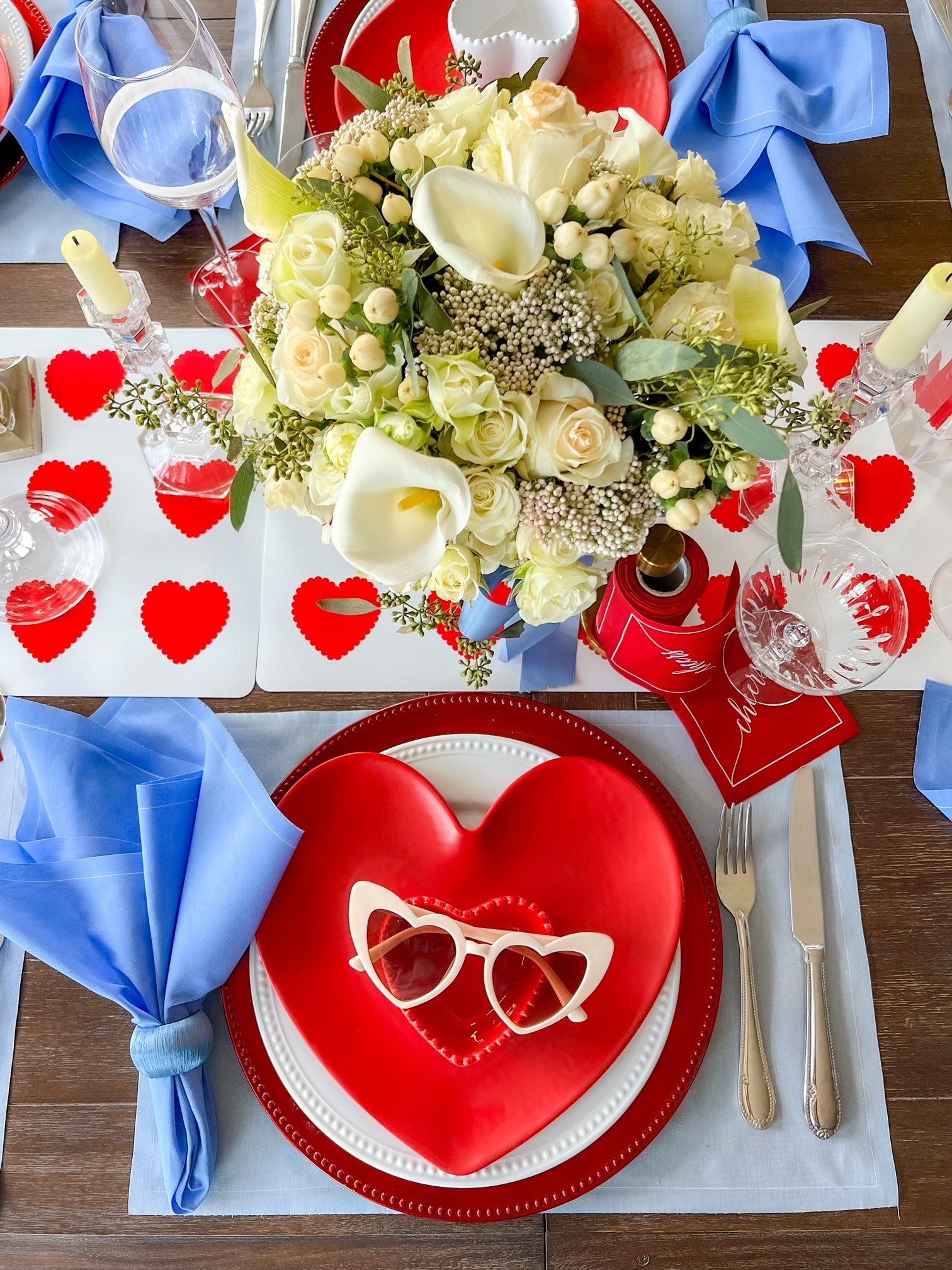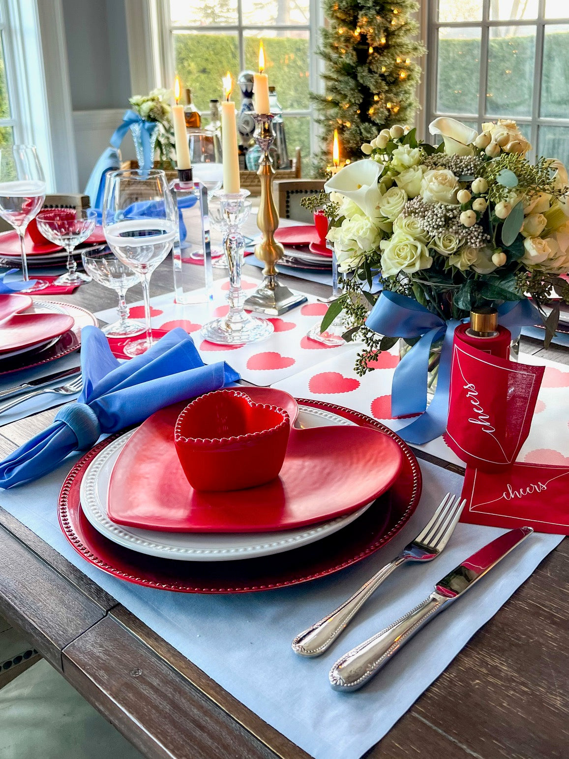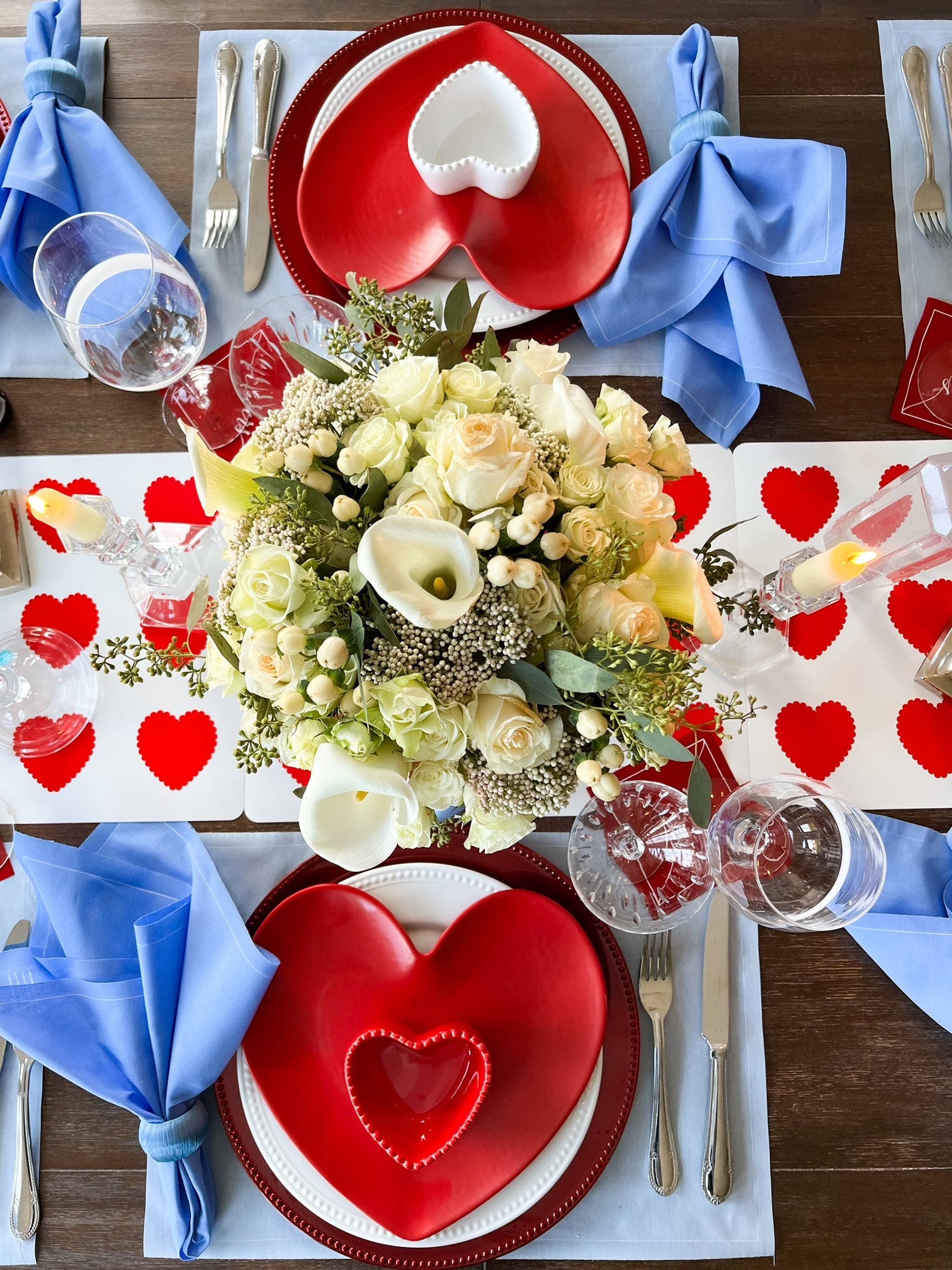 Set the scene for a fun and flirty Valentine’s celebration designed to bring a modern twist to classic romance, this vibrant setting features Glass Slipper (soft blue) placemats as a cool and unexpected base, paired with Summer Dreaming (periwinkle) dinner napkins for a dreamy, playful touch. Completing the look, our Red Carpet (bold red) cocktail napkins add the perfect pop of passionate color, making this tablescape a standout for Valentine’s Day gatherings.